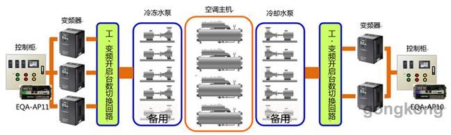 即冷凍水側可以啟動任意三臺水泵變頻節能運行,冷卻水側可以啟動任意兩臺水泵變頻節能運行。同時,變頻運行和工頻運行模式可以自由地進行切換,滿足不同的管理需求。