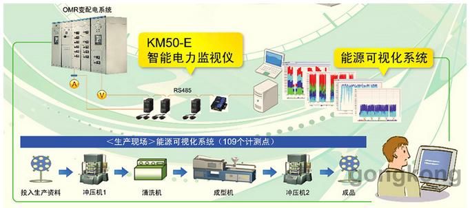 為了對工廠的生產和動力用電進行更好地監視,以便于管理用電以達到有效用電和節能的目的,我們在新OMR工廠對生產和動力用電共計109個計測點安裝了智能電力監視儀KM50-E.