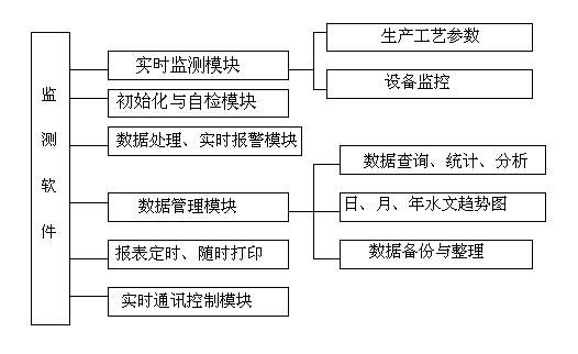 為了將系統(tǒng)集成為具有測量、控制、管理功能于一體的測控系統(tǒng),在車間級的Intranet中集成了生產(chǎn)在線數(shù)據(jù)庫以及控制參數(shù)與工藝數(shù)據(jù)庫服務(wù)器,生產(chǎn)在線數(shù)據(jù)庫服務(wù)器主要用于管理當(dāng)日當(dāng)班的人員、計劃調(diào)度以及生產(chǎn)完成情況,工藝數(shù)據(jù)庫服務(wù)器主要用于記錄生產(chǎn)工藝參數(shù)、重要工段以及重要設(shè)備的定時抽檢數(shù)據(jù)、故障幾率等,便于了生產(chǎn)管理。整個程序的設(shè)計功能如下: