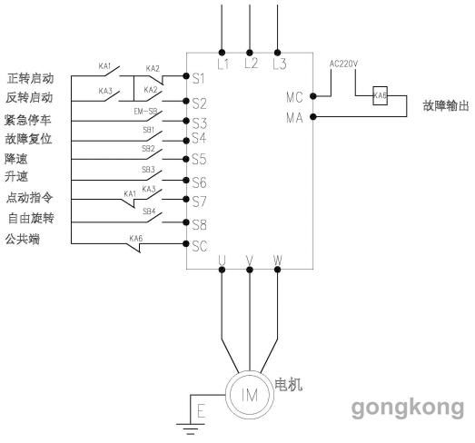 功能端子SC/S8可實現自由停車,SC/S4可實現報警復位,SC/S3可實現緊急停止,可根據需要選用。