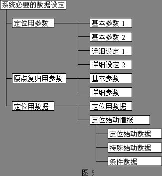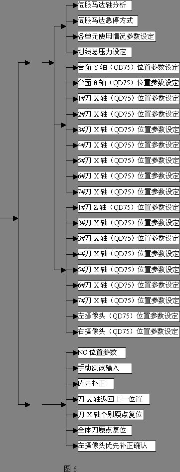 本系統采用的是A970GOT人機界面,在本系統中人機界面起了非常重要的角色,是其他任何器件都代替不了的。人機界面總共有218個畫面組成,主要分兩大部分:一是正常的操作人員操作的主畫面,二是設備維修、調試人員進入的特殊功能畫面,此畫面只有工程師級身份人員才能進入,它的參數直接影響設備的正常工作,圖6為特殊功能畫面的結構圖,其中主要是參數設定方面,這里主要介紹軸的位置參數設定,在本系統中最主要的部分就是伺服系統,它是保證系統精度的核心,伺服系統的參數、數據設定是非常復雜的,圖6為伺服系統參數設定的基本框架結構圖,基本參數主要是單位設定、1脈沖的相當移動量、脈沖輸出模式、轉動方向、速度限制值、加減速時間、馬達選擇。詳細設定除了對上面敘述中一些進行了詳細設定以外,還對其他的功能進行了設定,如M代碼的取碼模式、速度模式、JOG運轉、手動脈沖的選擇、圓弧誤差補正等等。原點復位參數設定主要是復歸的方式、方向、原點地址、速度。定位用數據就是我們所要求系統如何去工作、工作的步驟、數據等內容。伺服系統的工作主要是對內部寄存器的地址進行操作,主要分為參數區、監視區、制御數據區、定位數據區、PLC的CPU內存區、塊傳送區幾個部分。在圖5系統圖中對各個位置的設定(QD75)主要是對基本定位數據的設定,包括定位識別子、M代碼、指令速度、定位地址/移動量、突停減速時間、圓弧地址,其中每軸共設定了30點位置,這樣可以有效的適應系統切割復雜程度不同的基板。在人機界面的軟件設計中,把與伺服系統相關的定位數據參數直接編寫在畫面中,可以有效的對系統進行調整,改變,在系統中不僅僅上面的這些數據,另外與定位有關的參數設定還有很多,在這里就不一一列舉,本系統是一個非常復雜的系統。