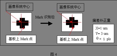圖3是本系統整個控制系統的原理圖,本系統采用Q06H CPU為控制單元,QD75D4和QD75D2為伺服系統的定位單元,還采用了兩個QJ74C24通訊模塊單元,其中一個與人機界面(A970GOT)連接,另外一個和畫像處理系統連接,畫像系統主要用于Mark點(也就是標記點)的識別,然后產生一個偏差的補正值。另外與QJ74C24相連接的PC1機是系統機械參數、工作參數設定以及切斷程序編制的專用機。PC1與PLC之間的通訊使用的是專門的通訊程序軟件。本系統的工作方式是采用偏差補正的方式。對于一個新的品種,首先要進行Mark點的識別,登錄,MARK點的形狀可以隨意,但一般采用的是’十’字為Mark點標記,如圖4所示,就是畫像處理系統對Mark點的認識過程,認識后產生一個偏差補正量,根據偏差量計算出基準位置。