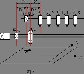 系統在機械參數設定好后,首先根據基板的劃線數據進行編程,確定劃線的數據、MARK點的數據、使用刀的數量、每把刀劃每條線的壓力、劃線的次數等, 以上參數有專門的軟件進行編輯。編輯完成后再通過PC1輸入PLC 的CPU,在完成數據的編輯后,軟件回自動生成切割的模擬畫面,確定基板劃線的每一步由哪幾把刀去做,在完成這一系列的工作后,就要放入基板試作劃線,根據系統設定,在放入基板后按下啟動按鈕,基板平臺會自動把基板送到影像處理系統的CCD的下面,在監視器上面看到的就如圖4所示,在MARK識別中與系統設定會有一個的偏差,根據這個偏差系統進行補正,現介紹一下補正過程,如圖7, 以第一把刀為例,刀1原點與CCD原點的X向距離D1在系統中設定為一定值,刀1與刀1原點的距離D2為在編制程序是產生,也為一定值,CCD原點與現在CCD之間的距離D3,在編制程序時有一個MARK的坐標值,D3即為基板的X向MARK坐標,D4為MARK點與刀1劃基板第一道線X向距離,在理想狀態下為一定值。即可以得出D1+D2=D3+D4,其中D1、D2為固定值,假設D5為CCD識別MARK點的動態坐標,偏差補正為△d,可以得出D5=D3±△d,如在理想狀態,CCD識別MARK點的X向坐標剛好為D3,即D5=D3,而每塊基板在放置的時候位置絕對會不一樣,所以都會有一個偏差△d,根據△d每次在CCD識別MARK點后向刀1移動的距離為D4±△d,這就是偏差補正的過程,其他的刀原理也是這樣,在偏轉劃線時也是根據CCD第一次MARK識別的坐標了確定的。在劃完了TFT面后,在 CF面對TFT面進行剖斷,然后在CF面劃線,再在TFT面對CF進行剖斷,這樣就完成了對基板的劃線。
