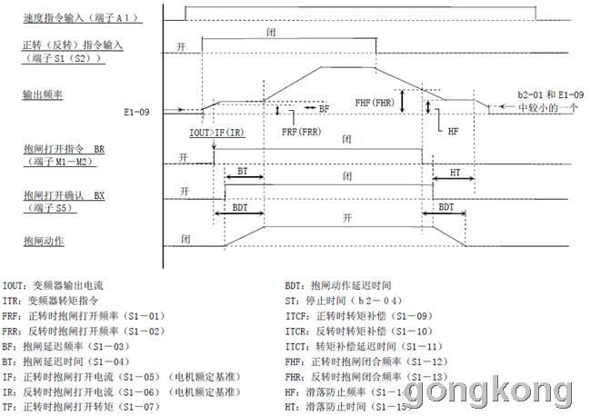 在調試時,若出現(xiàn)溜鉤現(xiàn)象,可適當調高抱閘頻率,但不宜設置過高,否則變頻器易報故障,一般設置在0.3~2Hz內。調試過程需注意以下幾點: