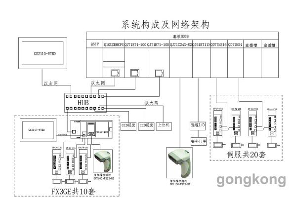 由于該機的從站控制器比較多,如果采用 CC-Link 網(wǎng)絡通信,那么主站和智能設備站都需要添加 CC-Link 模塊,這將會加大設備成本,而選用帶有內置以太網(wǎng)端口的Q系列CPU和帶有以太網(wǎng)端口FX3GE剛好解決了成本問題Socket通信 Q 系列內置以太網(wǎng)有 16 個通道滿足了 FX3GE 和觸摸屏、視覺的鏈接數(shù)量要求,并且主體 Q PLC 和FX3GE之間采用以太網(wǎng)通訊,通訊速度、數(shù)據(jù)量和刷新時間都能滿足要求,并且FX3GE-40MT/ES作為從站可以控制三個脈沖輸出,在伺服軸控制數(shù)量上也滿足了要求Socket通信 主體選用 Q 系列 CPU 并配置 QD77MS 系列伺服定位模塊,不僅節(jié)省了大量的配線,而且節(jié)省了程序開發(fā)成本,并且在控制軸的數(shù)量上能滿足要求Socket通信