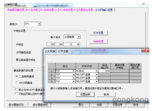 1,由于有 10 臺 FX3GE 與 Q CPU 通訊,如果 10 臺通訊同時調試加大了難度,所以可以先調試一臺 FX3GE 與 Q CPU 的通訊,首先設置Q 和FX 的通訊參數(shù),主要參數(shù)為使用通訊通道、IP 地址、通訊協(xié)議、打開方式、端口號、通訊數(shù)據(jù)代碼設置等。 FX3GE 參數(shù)設置如圖二。