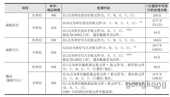 3,根據(jù)FX3GE 內置以太網(wǎng)MC 協(xié)議命令編寫相應的程序,MC協(xié)議讀寫軟元件時的主要命令和最大處理點數(shù)如圖四。