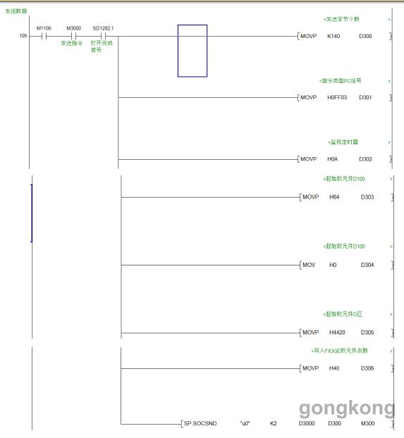 4,根據(jù)FX3GE 內置以太網(wǎng)MC 協(xié)議的命令格式在Q CPU內進行編程,首先用Q 內置以太網(wǎng)的打開/關閉命令(SP.SOCOPEN/ SP.SOCCLOSE)對各個通道進行打開和關閉處理,然后再編寫進行發(fā)送數(shù)據(jù)和接收數(shù)據(jù)處理的程序,有關Q CPU程序要向FX3GE發(fā)送的 MC命令格式的主要程序如圖七。