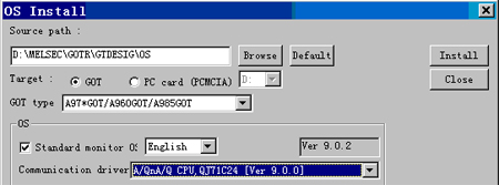 1. 安裝A9GT-RS4或A9GT-RS2通訊板,安裝對應的通訊驅動(A/QnA/Q CPU,QJ71C24)A900GOT