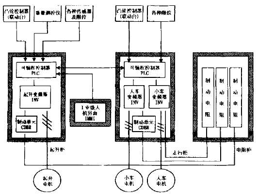 變頻調(diào)速控制系統(tǒng)采用獨(dú)立的控制柜,系統(tǒng)設(shè)計(jì)合理,外觀結(jié)構(gòu)十分簡(jiǎn)單,檢修方便。尤其是起升系統(tǒng)用一套裝置即可實(shí)現(xiàn)原兩套起升控制裝置的功能,既減輕了小車的自重,改善了鋼結(jié)構(gòu)的受力狀況,又增加了小車的維修空間,便于日常保養(yǎng)和維護(hù)。系統(tǒng)還具有過流保護(hù)、過壓保護(hù)、欠壓保護(hù)、短路保護(hù)、接地保護(hù)等功能,確保了控制、保護(hù)動(dòng)作的準(zhǔn)確性和可靠性。同時(shí),該系統(tǒng)也可增加自診斷功能,采用人機(jī)界而系統(tǒng),通過同PLC的通訊來實(shí)現(xiàn)故障實(shí)時(shí)顯示及處理對(duì)策,便于查找故障和維修。
