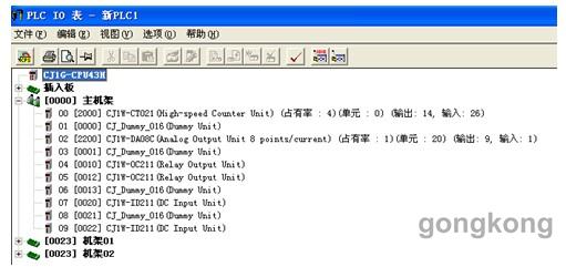1)、PLC配置:電源:CJ1W-PA205R 1個,CPU;CJ1G-CPU43H 3.0版1個,高速計數:CJ1W-CT021 1個,模擬量單元:CJ1W-DA08C,輸出:CJ1W-OC211 2個,輸入:CJ1W-ID211 2個。