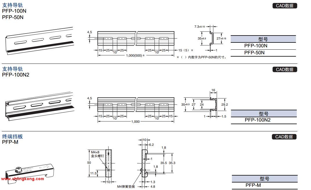 新增無螺釘系列。DIN導軌安裝配件,支持導軌。間距:7mm。