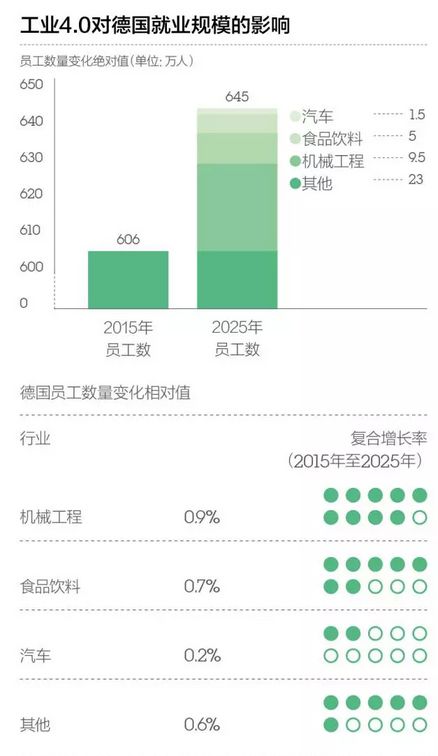 而另一份來自德國聯邦統計辦公室的數據顯示,2015年德國員工數量絕對值為606萬人,這個數字到2025年將達645萬人,增長6%。其中機械工程的新增就業人口最多,達9.5萬人,年均復合增長率為0.9%;食品飲料和汽車行業的新增數據分別為5萬人和1.5萬人,剩余23萬的增長空間來自其他行業。