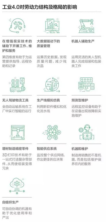 這一趨勢在工業4.0的進程當中也將持續,生產類崗位將減少12萬個,質量管理類崗位將減少2萬個,維護類崗位減少1萬個。簡單來說,那些低技術門檻及高重復率的工作將會受到波及。