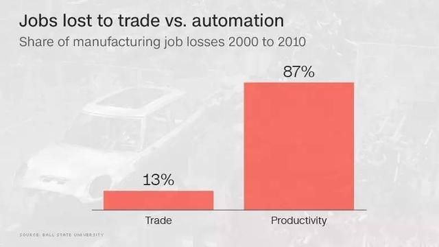據CNN,麻省理工大學經濟學家(David Autor)研究發現,1999年至2011年中美貿易減少美國制造業98.5萬崗位,經濟學家斯科特(Robert Scott)研究發現,1997年至2013年年間,美國與墨西哥之間貿易減少了制造業80萬工作崗位。