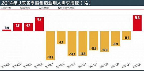 比如2014年第四季度制造業(yè)用人需求同比增速是8.2%,但是到了2015年,各季度受調(diào)查城市的制造業(yè)用人需求分別同比下降了17.1%、7.7%、14.7%、14.5%。2016年的四個(gè)季度制造業(yè)用人需求分別同比下降11.3%、12.3%、8.9%、5.1%。因此2017年一季度制造業(yè)用人需求增長9.3%是近兩年來首現(xiàn)出現(xiàn)正增長。