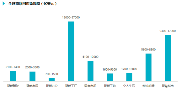 據中國物聯網研究發展中心的報道表明,到2018 年,物聯網行業市場規模預計將超過1.5 萬億元,CAGR 將超過30.0%,2020 年我國物聯網產業規模將達到2 萬億。據麥肯錫預測,2025年全球物聯網市場規模可達3.9~11.1萬億美元。