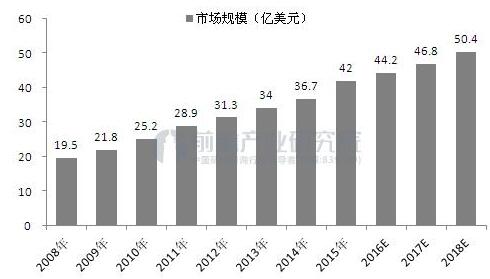 據前瞻產業研究院《中國機器視覺產業發展前景與投資分析報告》數據,近年來,全球機器視覺行業發展迅猛,2015年,全球機器視覺系統及部件市場規模已達42億美元,預計2018年市場規模將超過50億美元。
