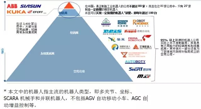 經過仔細的研究,我們發現除了排名前14家的機器人制造商之外,只有13家公司具備一定的生產和銷售能力。而另外95% 以上所謂的機器人公司實際上并不是制造商,而是具有不同能力的經銷商和系統集成商,其中很大一部分還是為了獲得地方政府補貼而成立的空殼公司。